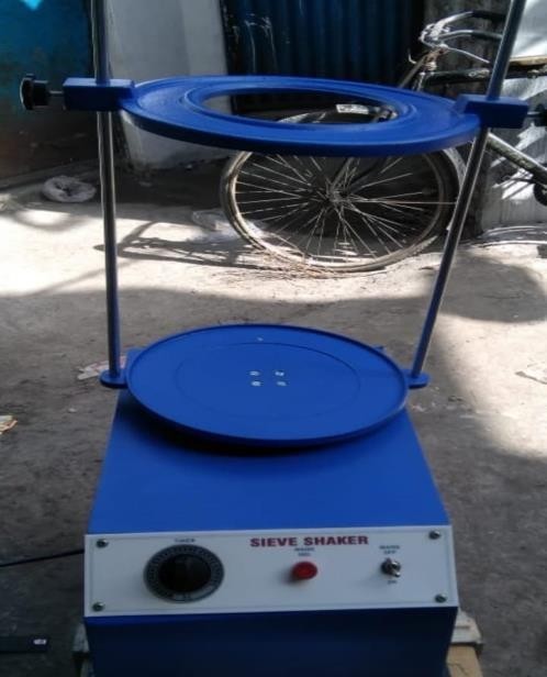 Motorised:-Carries up to 7 sieves of 20 cm diameter. The shaker is driven by a 1/4 hp. electric motor through a reduction gear. The sieve table does not rotable but is inclined from the vertical axis and the direction changes progressively in the clockwise direction. By removal of a stop-pin fixed to below the table, the shaker can have a rotatory motion. In addition to the gyratory motion of the table, there is an upward and downward movement ensuring that each square cm of the sieve is utilized. The whole gear mechanism runs in an oil bath.